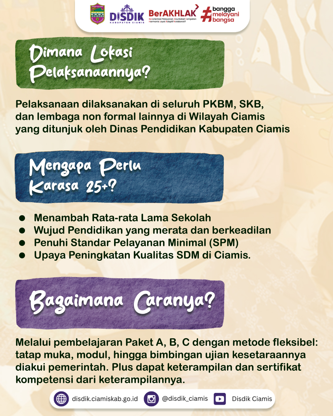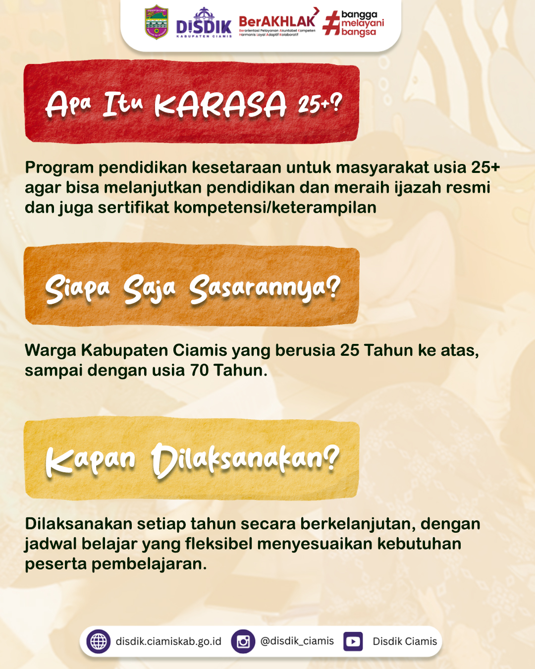 Hai #BarayaDisdikCiamis Program KARASA 25+ hadir sebagai wujud kepedulian Dinas Pendidikan Kabupaten Ciamis dalam membuka peluang belajar bagi masyarakat yang berusia di atas 25 tahun. Melalui jalur pendidikan nonformal, masyarakat tetap bisa menuntaskan jenjang pendidikan kesetaraan dan memperoleh ijazah yang diakui secara resmi.