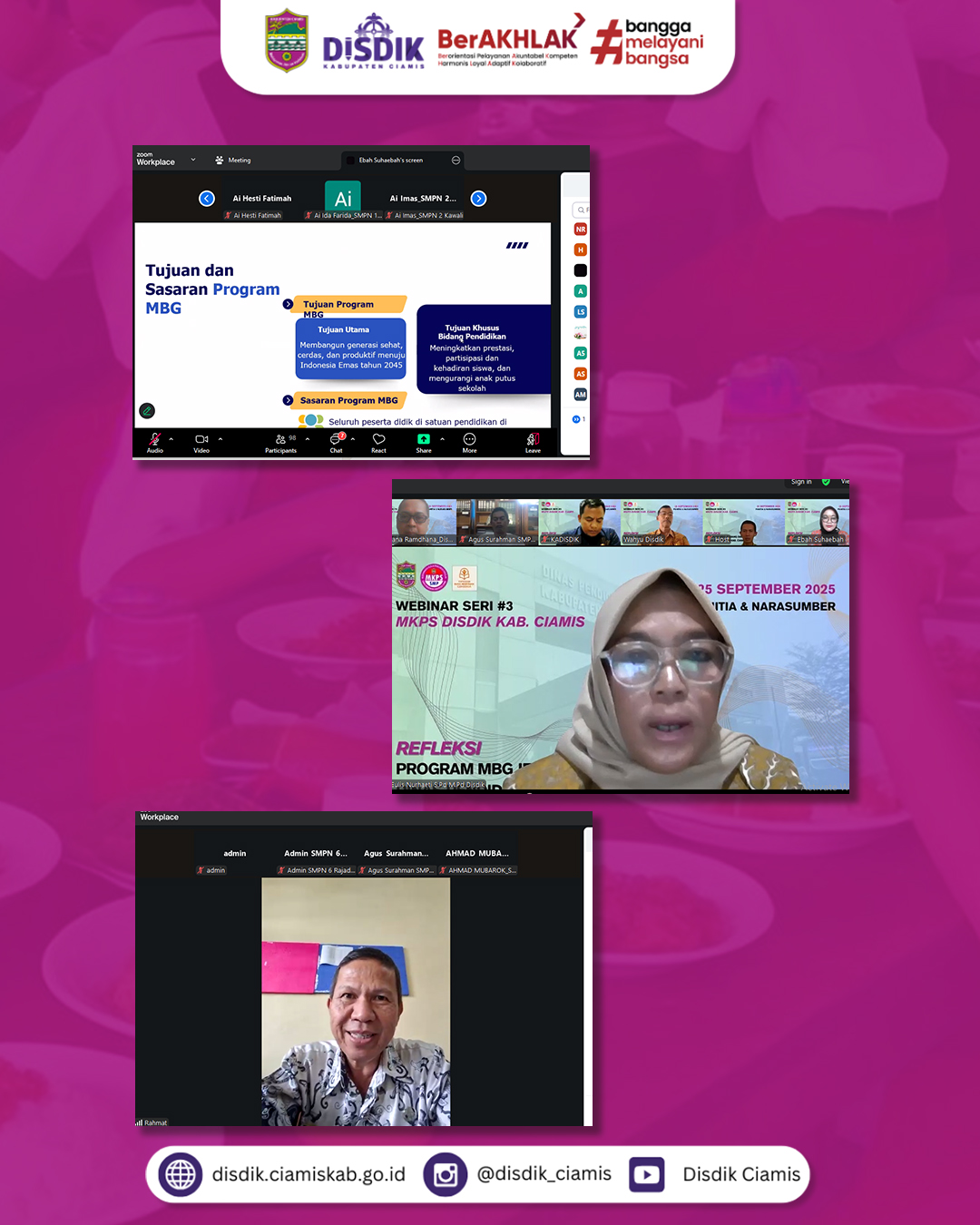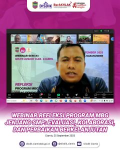 Dinas Pendidikan Kabupaten Ciamis menyelenggarakan Webinar Refleksi Program MBG jenjang SMP pada 25 September 2025 melalui Zoom Workspace. Kegiatan ini diikuti oleh Ketua MKPS SMP, Kepala Sekolah penerima MBG, guru dan tenaga kependidikan, serta tim teknis dan pelaksana program. Kegiatan ini menjadi ruang penting untuk evaluasi bersama dalam memastikan manfaat program benar-benar dirasakan oleh peserta didik.